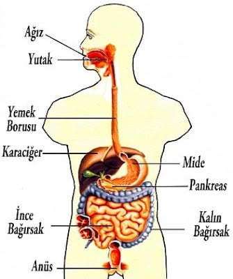 Besinler sırasıyla ağız, yutak, yemek borusu, mide, ince bağırsak, kalın bağırsak, anüs yolundan ilerleyerek sindirim sisteminden ayrılır.
