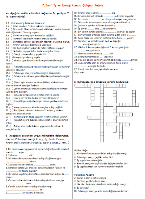 7.Sınıf İş ve Enerji Çalışma Kağıdı PDF indir