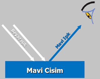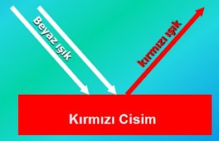 Örnek: Beyaz ışık gönderilen kırmızı cisim, kırmızı rengi yansıtır ve kırmızı renkte görülür, diğer renkleri ise soğurur.