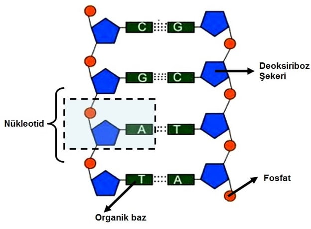 - DNA’nın yapısında dört farklı organik baz vardır. Bunlar Adenin (A), Timin (T), Guanin (G) ve Sitozin (S veya C) dir.