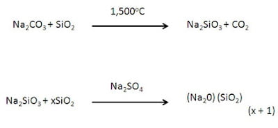 Na2CO3 + CaCO3 + 2 SiO2  →  Na2SiO3 +  CaSiO3  + 2 CO2