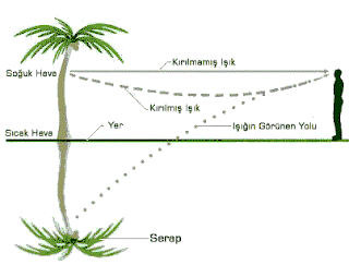Işık farklı sıcaklıklardaki hava katmanlarında tam yansıyarak serap olayı meydana gelir.